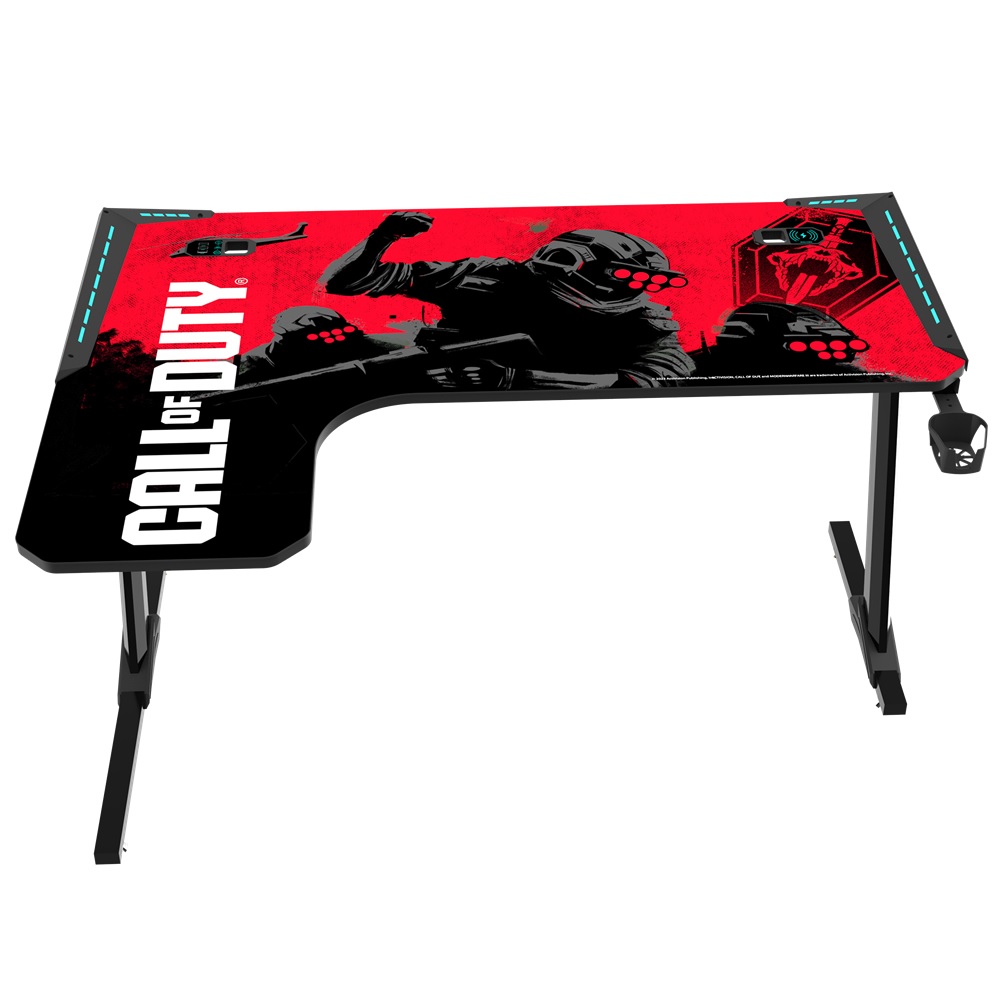 - مكتب ألعاب GameOn Call Of Duty (COD) Phantom XL-L على شكل حرف L، أسود/أحمر، مكتب ألعاب مزود بإضاءة RGB متدفقة مع لوحة ماوس، وخطاف سماعة رأس، وحامل أكواب، وإدارة الكابلات، وحامل لوحة الألعاب، وشاحن لاسلكي Qi وموزع USB