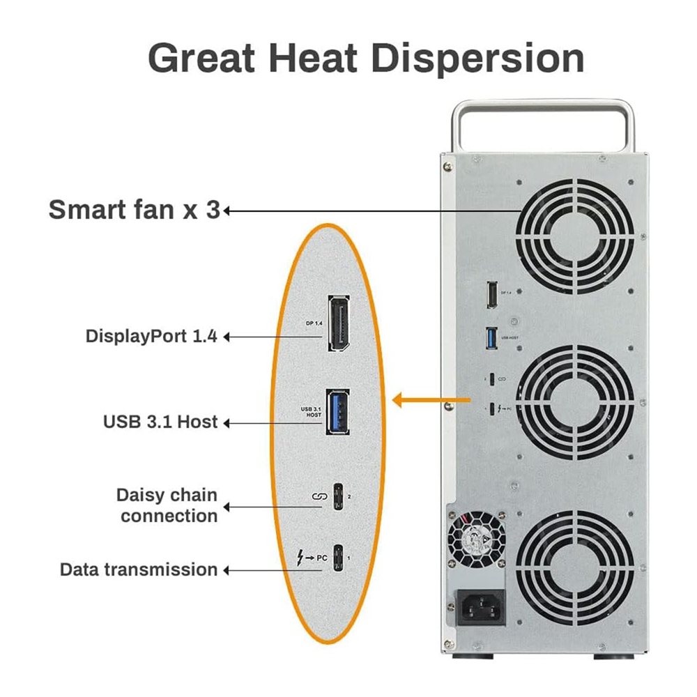 باستخدام منفذي Thunderbolt 3 ووحدة RAID للأجهزة، يمكن الوصول لسرعات 1600 MB/s في RAID 0 و 1440 MB/s في RAID 5 باستخدام SSDs من طراز HIKVISION V100.