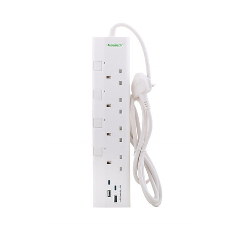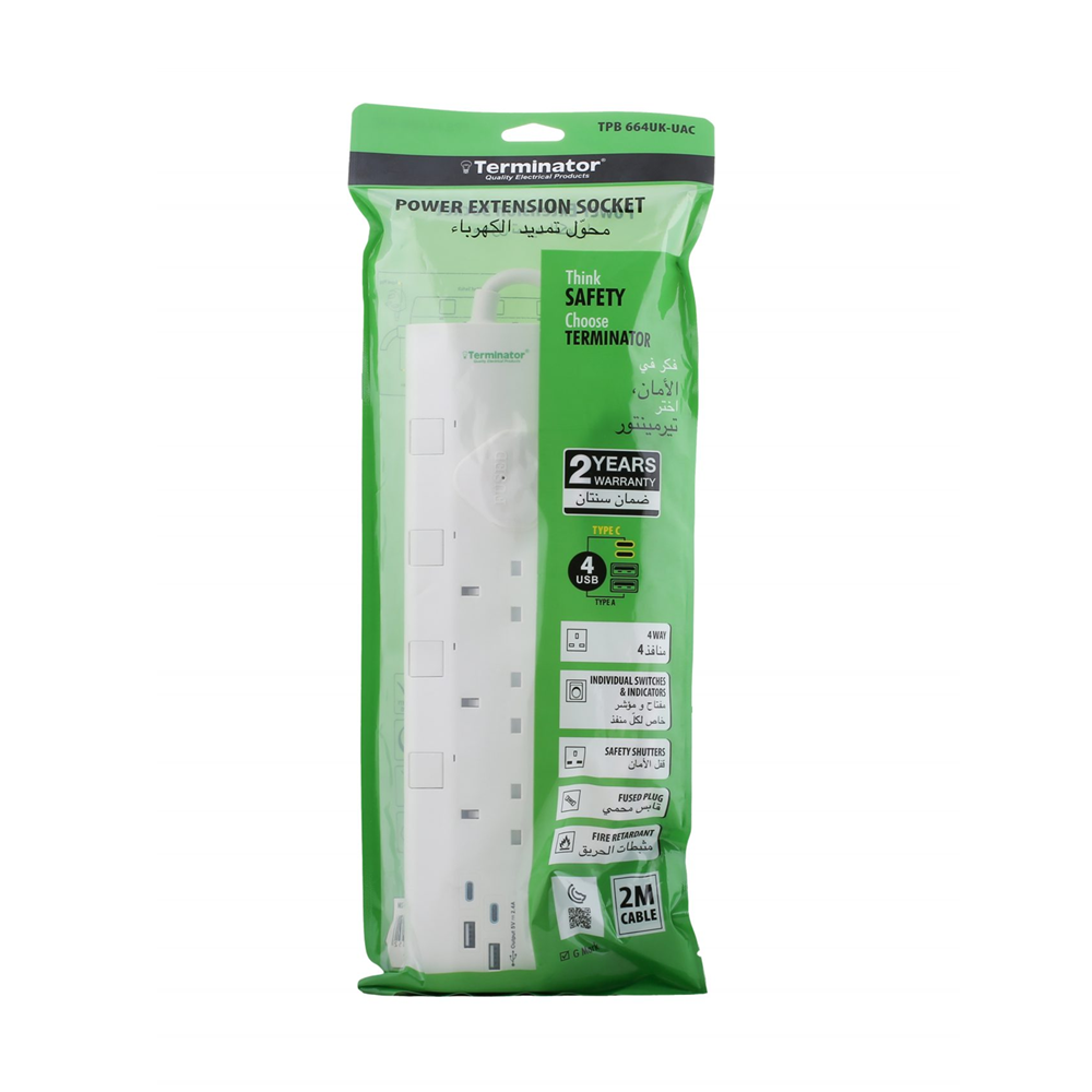 تيرميناتور 664UK وصلة كهربائية بـ 4 منافذ، مقبس بريطاني، 2 متر، 13 أمبير، مع 4 منافذ شحن USB