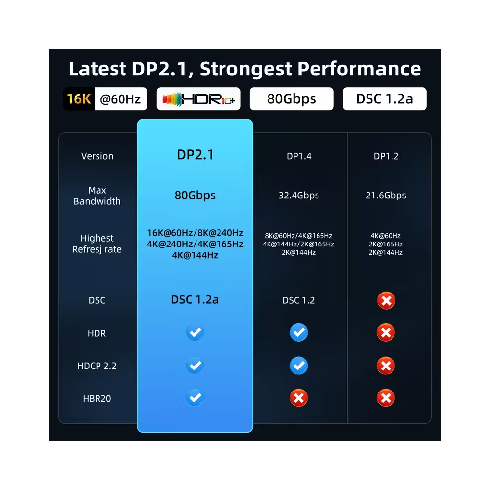 DisplayPort Cable 2.1, 16K DP 2.0 Cable [16K@60Hz, 8K@120Hz 4K@240Hz 165Hz 144Hz] Support 80Gbps, HDCP DSC 1.2a, HDR10 FreeSync G-Sync For Gaming Monitor