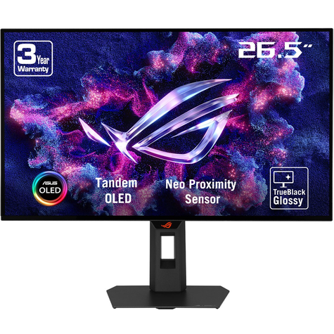 ASUS 26.5″ WOLED Resolution : 2560×1440 Refresh Rate (max) : 280Hz Response Time : 0.03ms (GTG) Display Surface : Glossy (TrueBlack Glossy) Tilt / Swivel / Pivot / Height / Wall-mount