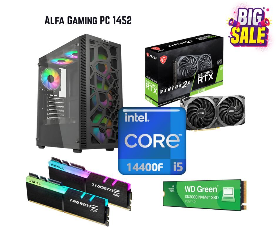 Alfa Gaming PC 1452 Intel Core i5-14400F 12th Gen Processor GSKILL 16GB DDR4 3600MHz RAM Trident Z RGB WD Green 500GB SN3000 M.2 NVMe SSD PCIe Gen4 MSI 12GB GeForce RTX 3060 VENTUS 2X OC VGA Graphic Card